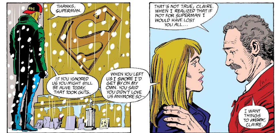 Sem saber ainda destes acontecimentos, Mitch, juntamente com Jimmy agradece a Superman, diante da sua tomba funerária, antes da viagem de regresso para junto da sua mãe (em Superman #76, Vol 2, de 1993).