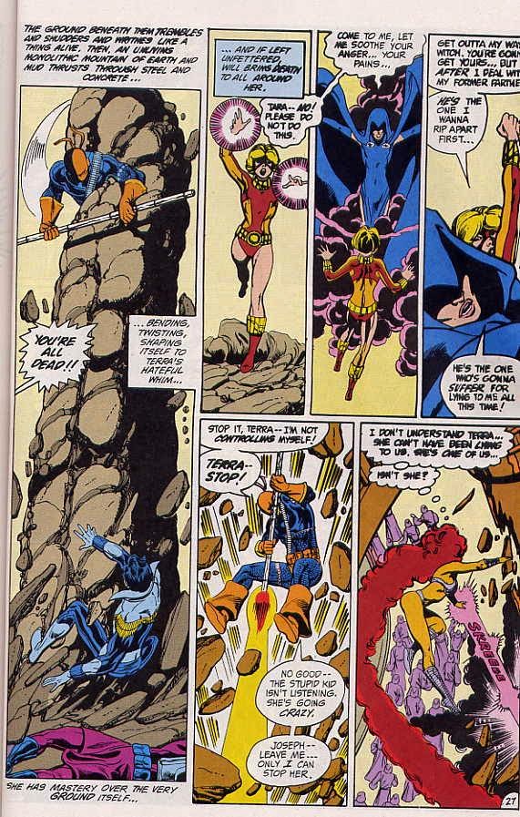 A sua primeira aparição demonstra esta mesma agressividade e, simultaneamente, uma necessidade em ser agarrada e acarinhada. Beast Boy, um dos membros mais antigos dos Titans, vai aperceber-se disso e recruta a jovem. A maioria, com excepção de Raven, engolem esta fachada de menina inocente e fragilizada. No entanto, no magnífico arco “Judas Contract”, é revelado que Tara está infiltrada nos Titans e trabalha em concluío com Deathstroke, de quem é, ao mesmo tempo amante. Para Terra não há redenção final. Tara mostra a sua verdadeira natureza psicótica e odiosa, o que, em última instância, irá conduzir à sua morte.